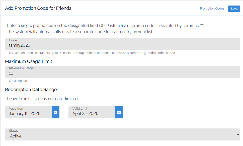 - Promotion Codes: Enter at least one code the registrant will type in. You can enter multiple codes separated by commas. Additional codes can be added later.