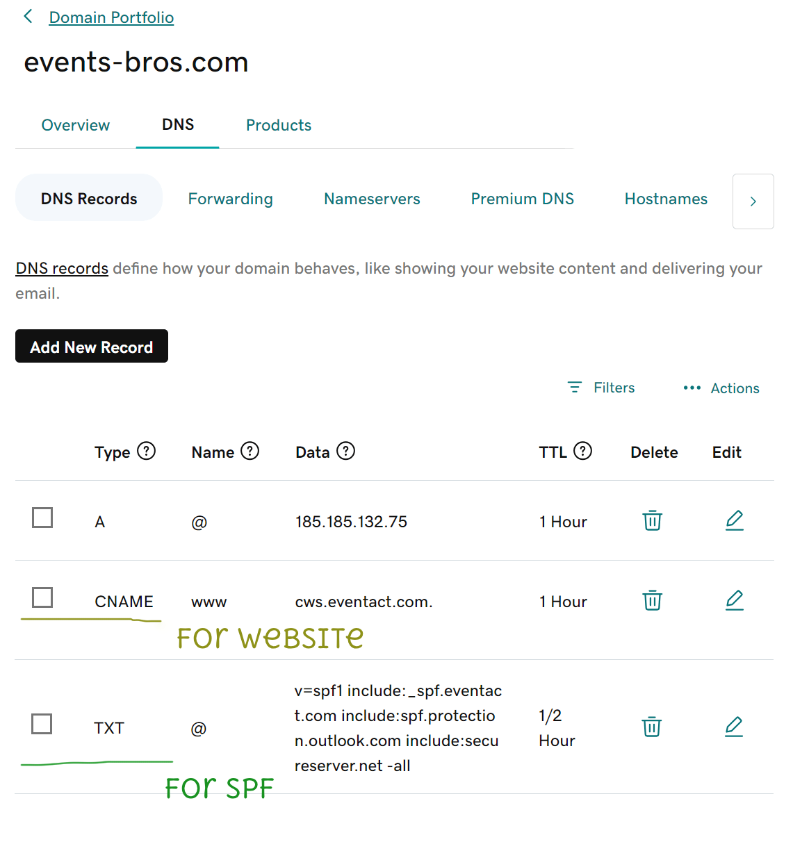 Point the CNAME record to cws.eventact.com (e.g., set up events.event-bros.com to point to cws.eventact.com).